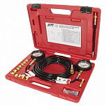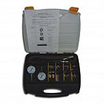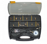 Тестер давления позволяет осуществить диагностику системы смазки двигателя и трансмиссии, в т.ч. датчиков давления. Удобный в использовании, так как оборудован самозапорными соединениями. Манометры и адаптеры (19 штук) размещены в удобном чемодане-кейсе с ложементом. Каждый из адаптеров поставляется с комплектом запасных колец.