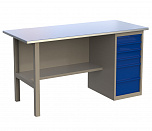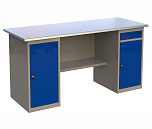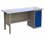 Стол бестумбовый поставляется в разобранном виде (4 места). Нагрузка на столешницу до 600 кг. Стандартный цвет: корпус - серый глянец RAL 7030, ящики и двери тумб - синий RAL 5017. Размеры: 855х1200х700мм. Вес: 40 кг.