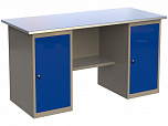 Верстак двухтумбовый поставляется в разобранном виде (4 элемента). Нагрузка на столешницу до 600 кг. Стандартный цвет: корпус - серый глянец RAL 7030, ящики и двери тумб - синий RAL 5017. Размеры: 855x1400x700 мм. Масса: 78 кг.