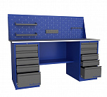 Двухтумбовый. Допустимая нагрузка на столешницу 1000 кг. Опорные элементы выполнены сварными из холоднокатаной стали. Для выполнения сборочных, ремонтных, слесарных, монтажных и других видов работ на производстве, в сервисных центрах, мастерских, гаражах, а также для обучения технологии в учебных заведениях. Комплектуется полкой-стенкой, расположенной под столешницей для удобного размещения габаритного инструмента и оснастки. Размеры верстака: 855x1796x696 мм. Вес: 121 кг. Поставляется в 4 комплектациях на выбор.