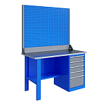 Однотумбовый. Допустимая нагрузка на столешницу 750 кг. Опорные элементы выполнены сварными из холоднокатаной стали. Верстак состоит из столешницы, опоры, тумбы P5 с четырьмя малыми и одним большим ящиком, полки-стенки, двойного экрана с кронштейнами. Столешница состоит из фанеры марки ФСФ толщиной 24 мм, которая покрыта лаком-антисептиком и листом оцинкованной холоднокатаной стали толщиной 1,2 мм. Размеры (ВхШхГ) 1965x1396x696 мм.
