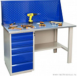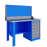 Однотумбовый. Допустимая нагрузка на столешницу 750 кг. Опорные элементы выполнены сварными из холоднокатаной стали. Верстак состоит из столешницы, опоры, тумбы P5 с четырьмя малыми и одним большим ящиком, полки-стенки и одинарного экрана с кронштейнами. Все металлические элементы покрыты полиэфирной порошковой краской. Столешница состоит из фанеры марки ФСФ толщиной 24 мм, которая покрыта лаком-антисептиком и листом оцинкованной холоднокатаной стали толщиной 1,2 мм. Размеры (ВхШхГ) 1470x1396x696 мм.