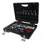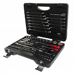 Набор инструментов в чемодане 1/4" & 1/2" 6-гранный 156 предметов. В наборе: головки 1/2", 1/4" (6РТ), головки глубокие 1/2", 1/4" (6РТ), головки TORX 1/2", 1/4", трещотка 1/2", 1/4", удлинитель 1/2", 1/4", кардан 1/2", 1/4", вороток-отвертка 1/4", держатель для бит 1/4", переходник 3/8", свечная головка 1/2" (6РТ и 12РТ), держатель для бит 5/16", вороток с шарниром 380 мм, вороток Г-образный 260 мм, биты 1/4", биты 5/16", ключи рожково-накидной: 6-24 мм, ключи разрезные, Г-образный ключ HEX, пассатижи 7", бокорезы 6", клещи с фиксатором 10", молоток 500 г, набор выколоток и зубил, отвертки с антискользящей рукояткой.