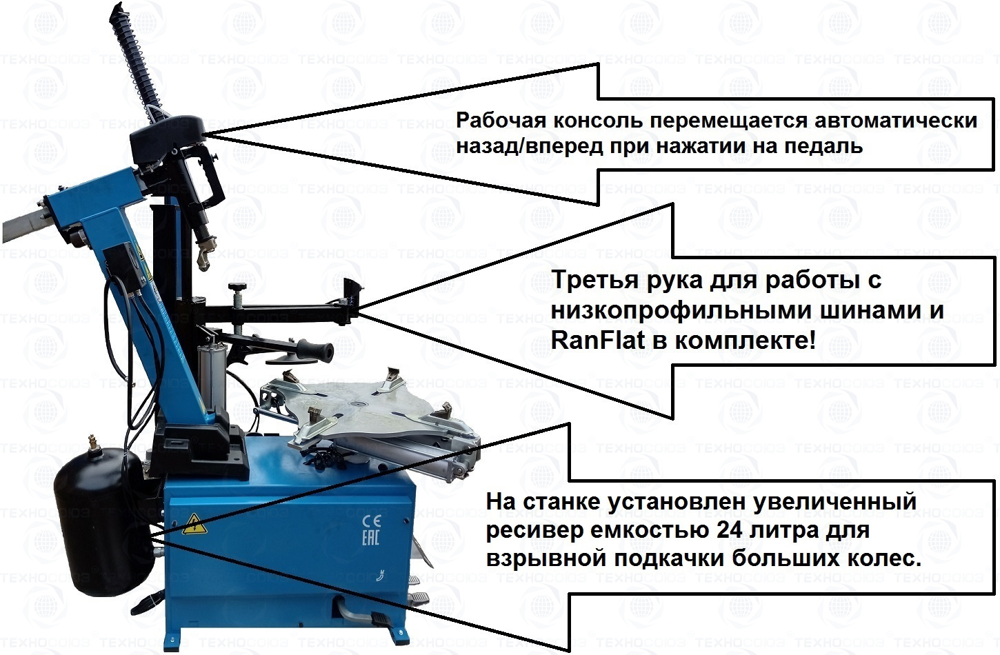 автоматического шиномонтажного станка TS-3226А. Для дисков: 11÷24”. В комплекте: полноценная 3-й рука для работы с жесткой и низкопрофильной резиной RUNFLAT. + встроенный бустер 24 литра (взрывная подкачка) + пистолет для подкачки шин + монтажка + регулятор давления с влагоотделителем и манометром