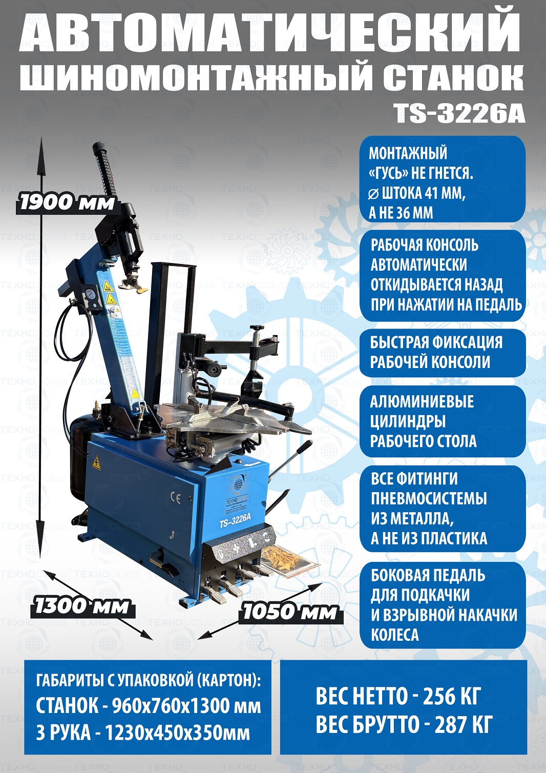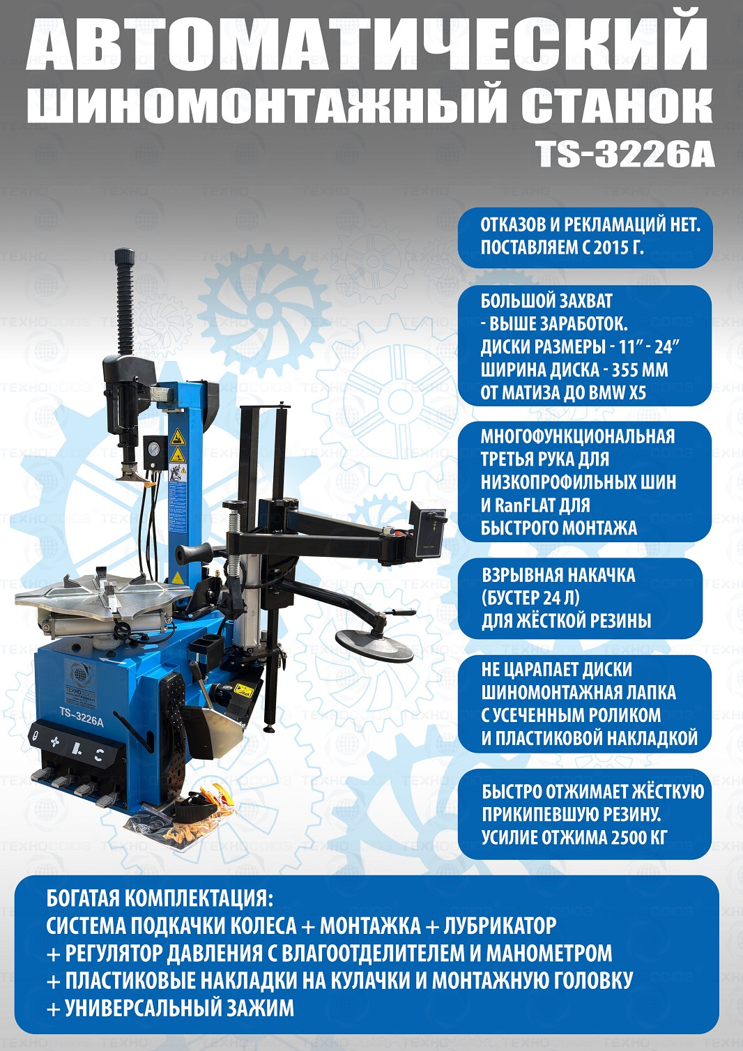Автоматического шиномонтажного стенда TS-3226А предназначен для монтажа и демонтажа шин легковых автомобилей, внедорожников и легких грузовиков с размером колес 11-24 дюйма. Усилие пневмоцилиндра в 2500 кг. В комплекте: полноценная 3-й рука для работы с жесткой и низкопрофильной резиной RUNFLAT. + встроенный бустер  24 литра (взрывная подкачка) + пистолет для подкачки шин + монтажка + регулятор давления с влагоотделителем и манометром.