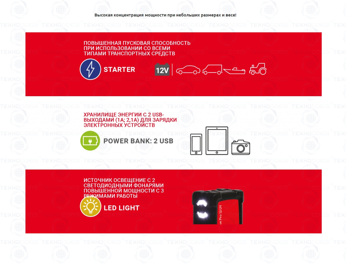Надежное, универсальное и компактное (за счет литиевых аккумуляторов) пусковое устройство для профессионального использования. Корпус аппарата оснащен резиновой накладкой, которая обеспечивает его ударопрочность. Предусмотрена защита от неправильной полярности.