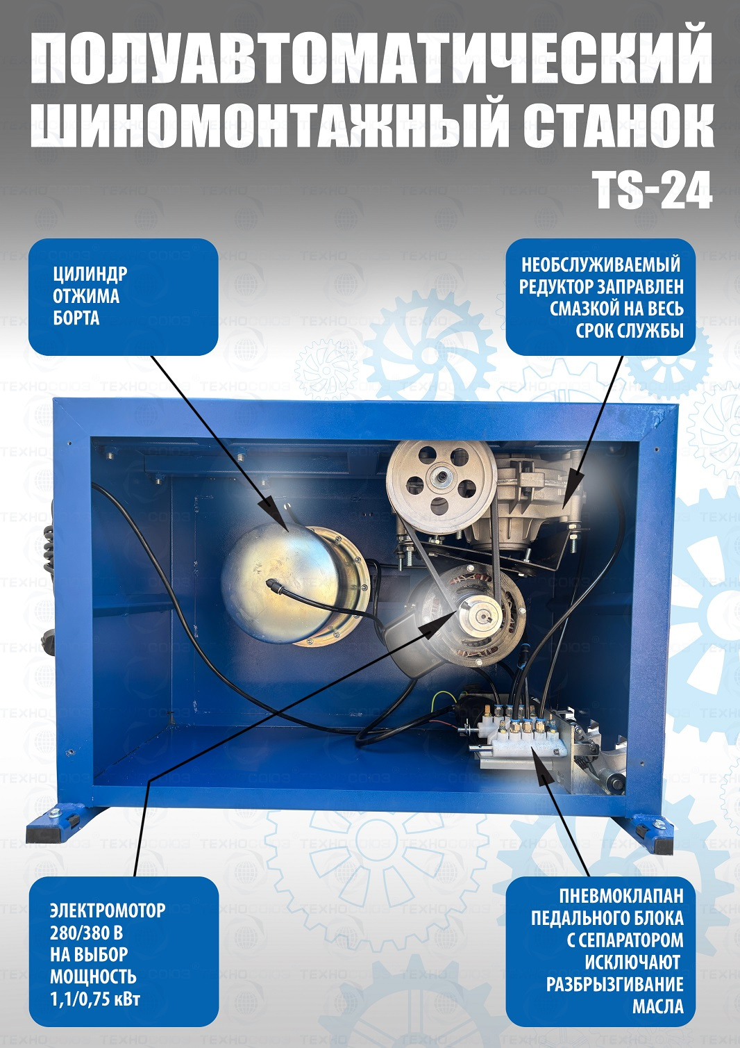 Шиномонтажного станка TS-24. Полуавтоматический. Квадратный стол. Для дисков:11÷24”. Усилие отрыва покрышки 2700 кг. В комплекте: пистолет с манометром для подкачки шин + монтажка + пластиковые накладки на зажимные кулачки + регулятор давления с влагоотделителем и манометром. Надежные - не подведут в сезон!!! Напряжение шиномонтажных станков 220В или 380В на выбор.