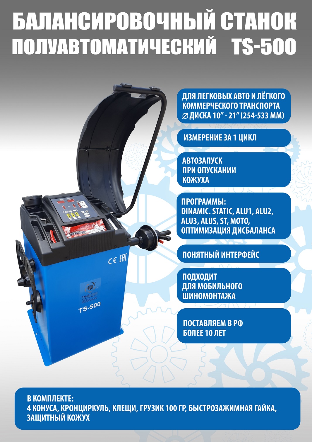 + TS-500 Балансировочный станок для колес легковых автомобилей, мотоциклов и легких грузовиков. В комплекте: кожух с автозапуском + клещи + кронциркуль + быстрозажимная гайка + набор конусов. Для балансировки колес диаметром до 760мм. Размеры диска: ширина 3–9” (76-228 мм) , диаметр колеса" - 10–21” (254-533 мм). Максимальный вес колеса с диском – 65 кг. C кожухом. Точность ±1гр. Напряжение 220В.