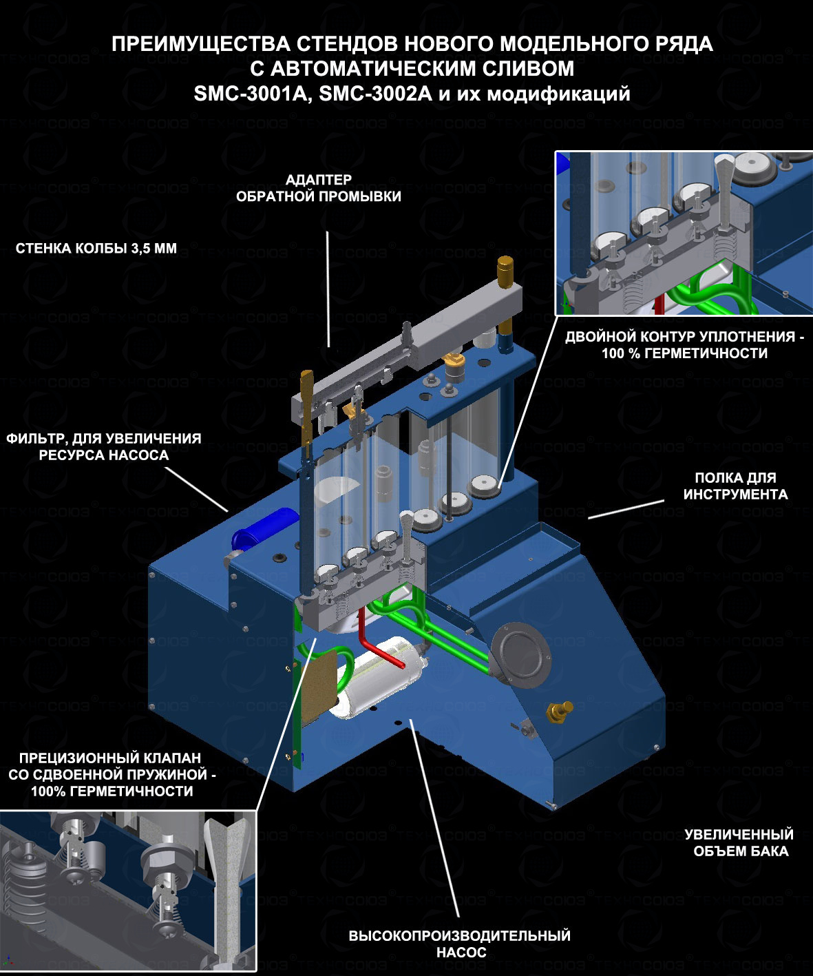 - Усовершенствованная конструкция стенда обеспечивает надежную герметичность соединений;