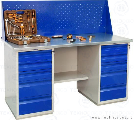 Верстак металлический двухтумбовый с 5 выдвижными ящиками. Размеры, мм: 866х1600х700.